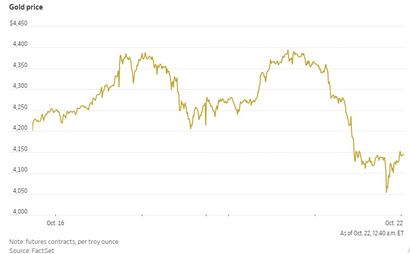 After an explosive rally, precious metals reversed course Tuesday, with gold tumbling 5.7%, its steepest single-day drop since 2013, just one day after reaching record highs. Silver and major mining stocks, including Newmont, also slumped. In contrast, blue-chip stocks surged, led by General Motors’ nearly 15% jump to a record close following standout quarterly results. RTX shares also rose, while Netflix slipped after missing profit expectations.