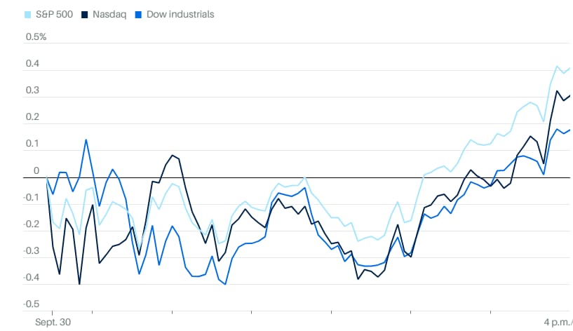 Stocks closed higher Tuesday, capping the S&P 500’s best September in more than a decade. The Dow rose 82 points to a record high, while the S&P gained 0.4% and the Nasdaq added 0.3%. The rally has been fueled by AI-driven momentum and the Fed’s recent rate cuts, with traders betting on more easing before year-end.